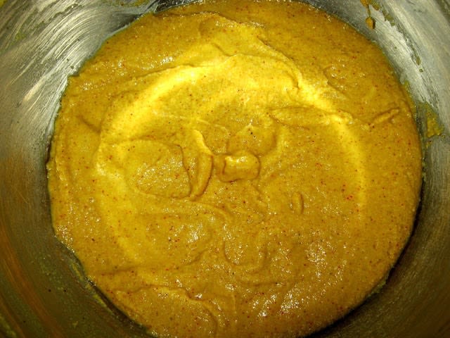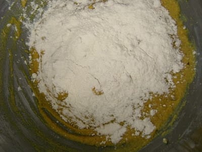 - Transfer mixture to a mixing bowl. Now add all of the dry spices and mix till they are incorporated. Add baking powder, yeast, and flour. Mix thoroughly.