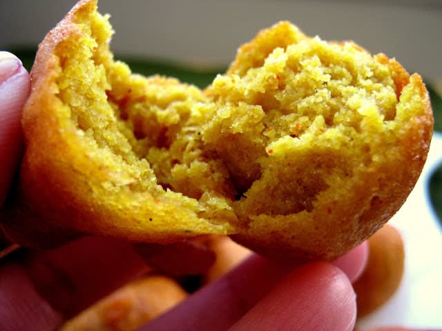 Since I moved away from home to Rochester, NY, you have to imagine that Pholourie is not something I can find easily in a store as there aren't any Guyanese roti shops lingering around here. So the next best thing to satisfy this craving was to call my mom for her recipe and try it out myself. I have to tell you when I took a bite into the finished product, it brought my right back to my childhood.