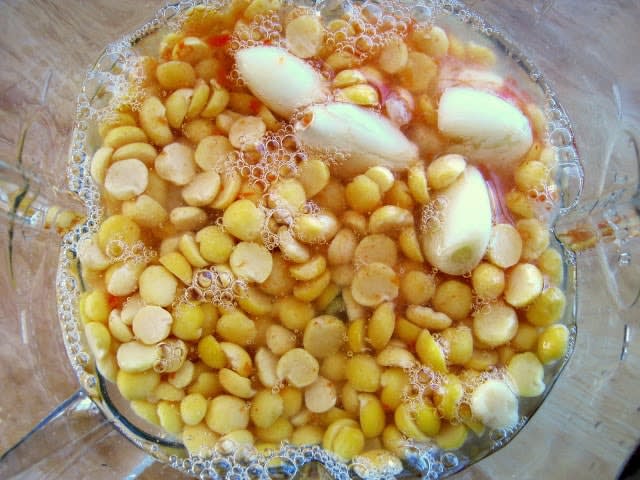 - The next morning, drain the water from the peas. In a blender, put peas, garlic and pepper or pepper sauce, and enough water to cover the peas and blend on high till smooth.